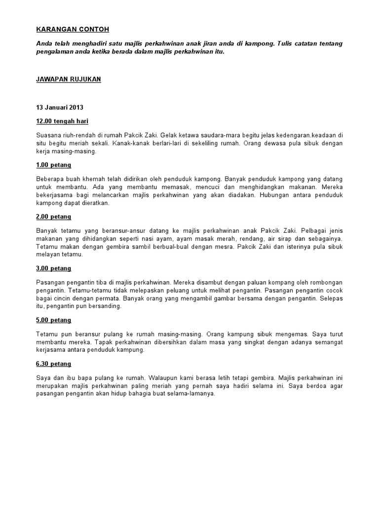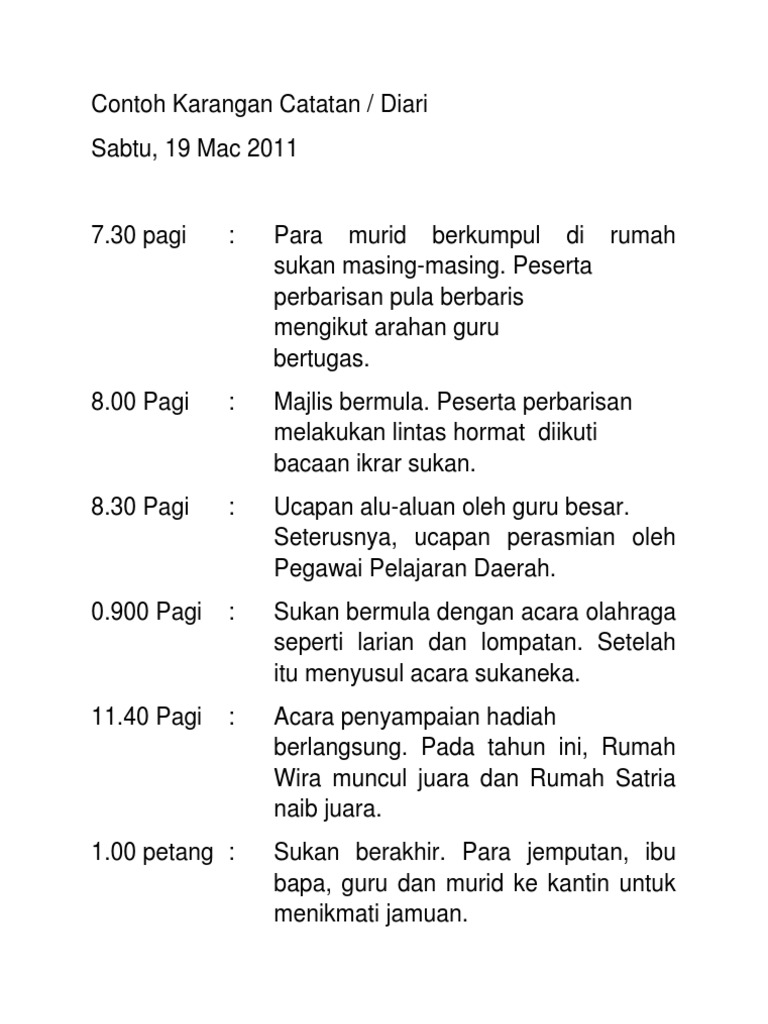 Contoh Karangan Diari Catatan Sekolah kamu telah mengadakan sambutan Hari Guru. Karangan jenis ini menghendaki anda melaporkan sesuatu peristiwa yang didengar atau dilihat. FORMAT KARANGAN JENIS LAPORAN.